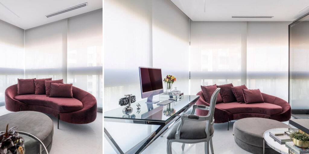 Marcante define a presença do marsala, que na história da arquitetura fez presença como uma cor ligada à aristocracia. Entretanto, os tempos mudaram: os tons de vinhos seguem eternos nos projetos, mas como uma pegada moderna. “Ela vai muito bem nos sofás”, reitera Ana.