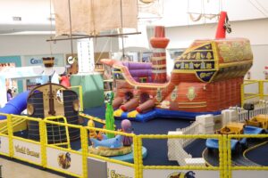 A Ilha dos Piratas possui trenzinho em formato de barco, navio inflável, navio de madeira...